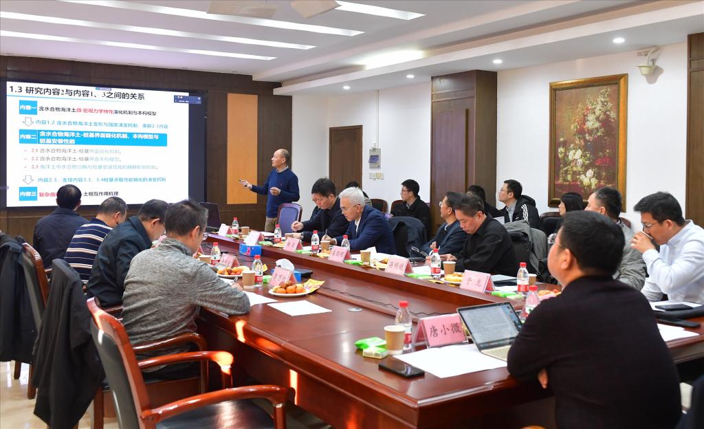 姜朋明介绍了我校发展历史和土木工程学院近五年承担的国家自然科学基金项目情况和各项科研成果。姜朋明指出,此重点项目以我国深海油气资源高效开发国家重大需求为指引,聚焦含水合物海洋土中桩基安全核心技术难题。我校作为参与单位,将为实现国家海洋强国战略积极贡献智慧与力量。