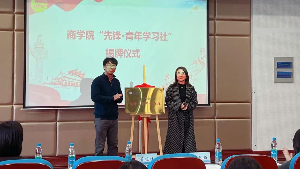 周思颖和董现珠为商学院“先锋·青年学习社”揭牌。董现珠寄语青年学生要夯实理论基础、发扬互助精神、坚持创新实践,在奋斗中实现人生价值。