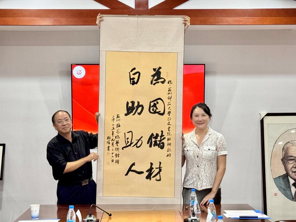 会上,张菡介绍了我校敬文书院育人情况。她表示,此次书画展既有知名书画家的匠心之作,也有我校老师的翰墨丹青,更不乏敬文书院学子们充满朝气的习作,共同描绘吴地山水歌颂伟大祖国,不仅是一场艺术的盛宴,更是一次生动的“大思政课”。袁成亮介绍了本次书画作品展的筹备过程、作品特色与展出规划,并向敬文书院赠送书法作品。