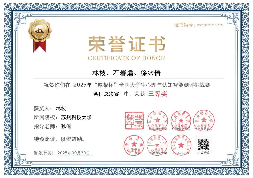 我校学子在首届“厚粲杯”全国大学生心理与认知智能测评挑战赛中获三等奖