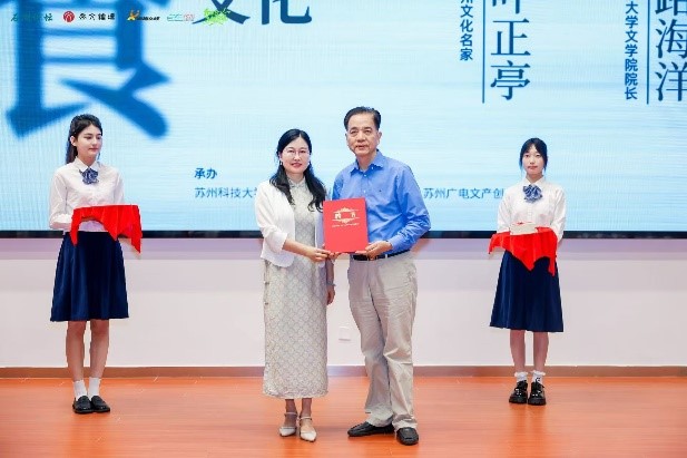 10月15日下午,由苏州广电文产创意中心都市音乐频率全新推出的青年文化品牌“当燃艺语”艺术讲堂在我校正式启动,校园艺术展陈品牌“微展”同步亮相。苏州市政协原文史委主任、苏州民间文艺家协会原主席叶正亭以“苏州美食文化”为主题,与我校师生展开了一场生动有趣的文化对话。讲座由全国优秀音乐主播、苏州都市音乐广播陆忆思主持,文学院院长路海洋与嘉宾对话,带领青年学子深入体验江南文化的历史与精髓。