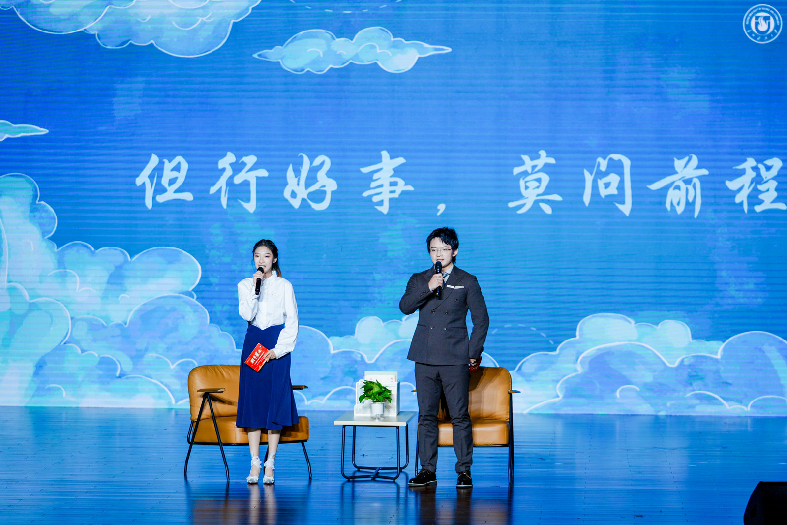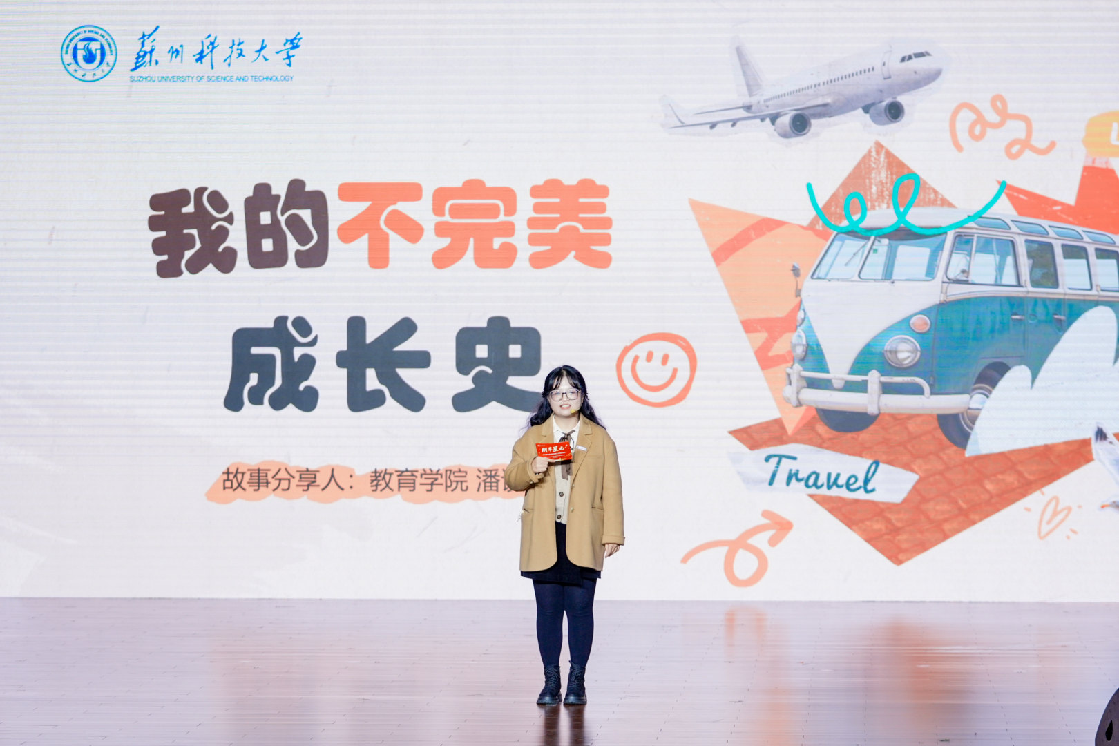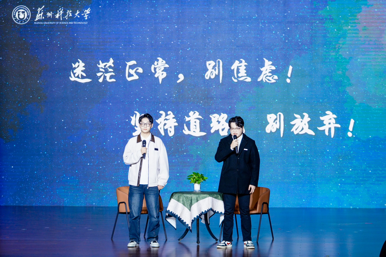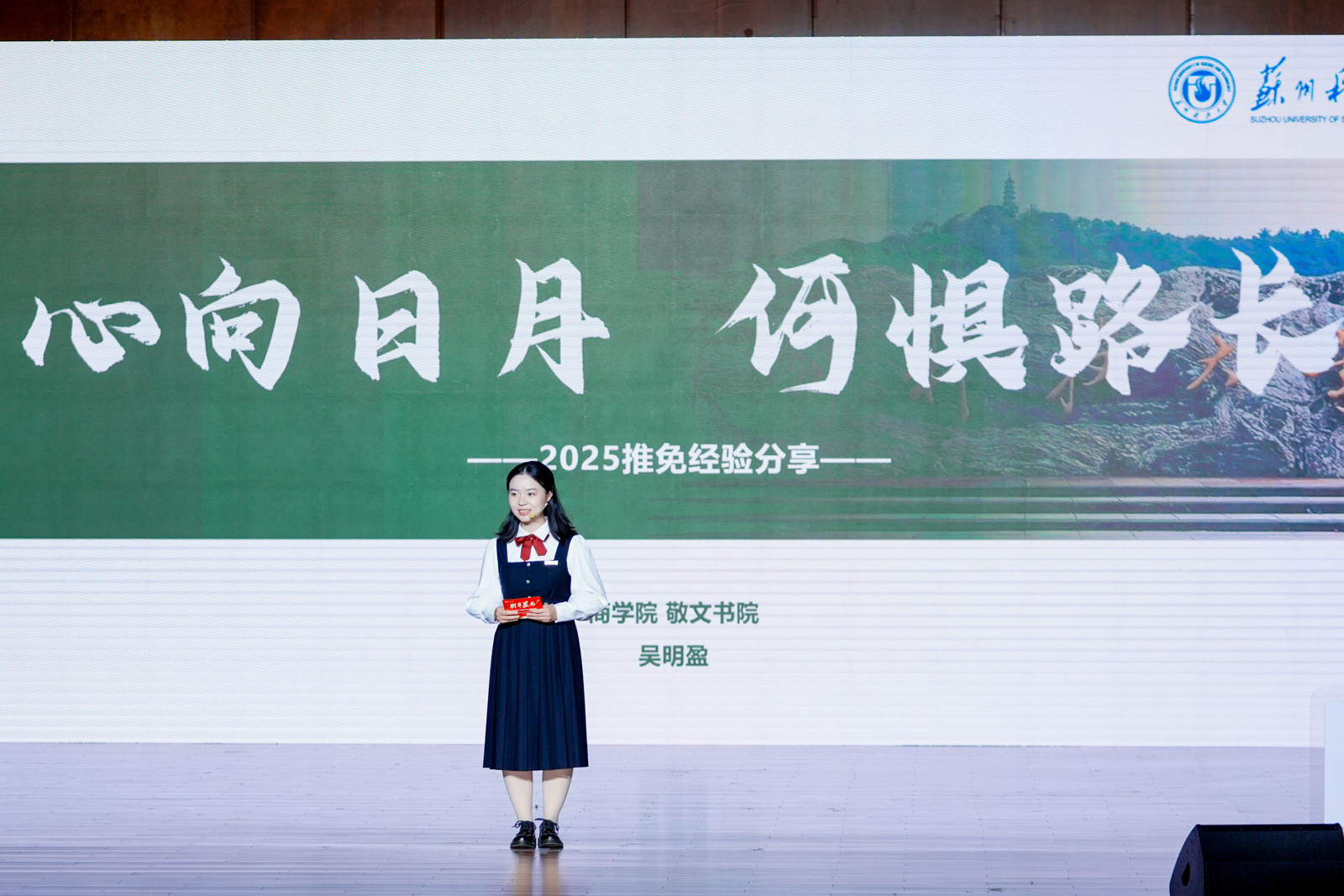分享会在青春励志视频中拉开序幕。围绕“人生选择、自我成长、心态转变、实践探索”四大主题,来自物理科学与技术学院的孙文星、地理科学与测绘工程学院的杨凯以对话形式,讲述了他们从迷茫走向坚定的求学心路;教育学院的潘谟仪以轻松幽默的脱口秀,分享了个人成长的独特体验;建筑与城市规划学院的李昊桐、环境科学与工程学院的王天宇通过互动访谈,探讨了如何平衡科研、竞赛与学生工作关系;商学院的吴明盈以主题演讲的形式传授了推免面试经验。最后七位保送至本校的学子以《少年》为生动注脚,诠释了苏科大学子笃行不怠、追梦不止的青春风采,成为昂扬精神的最佳写照。