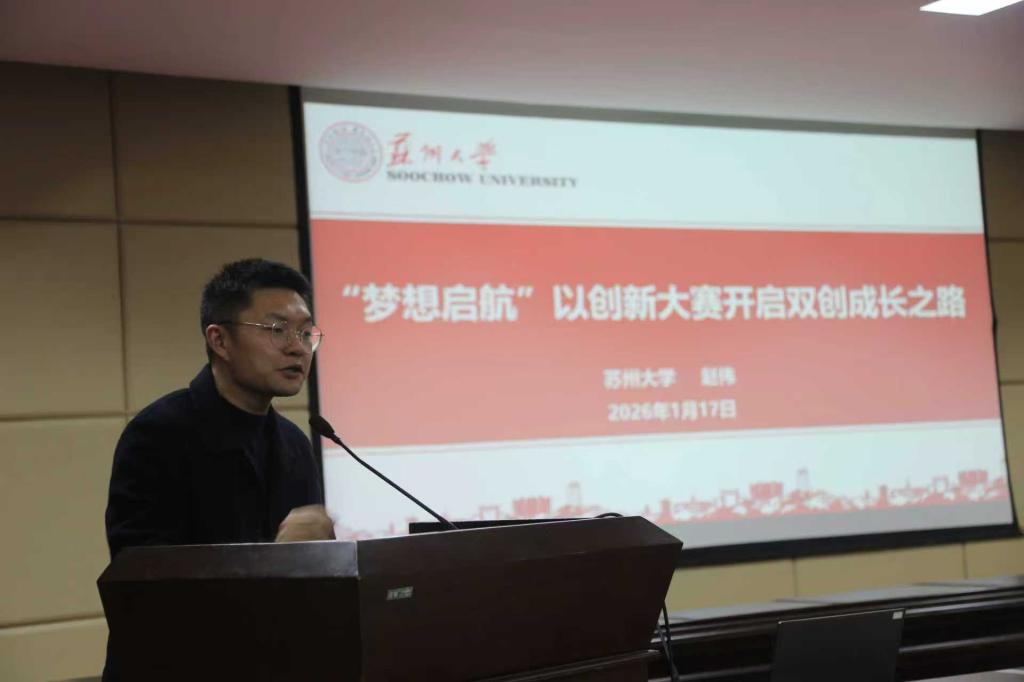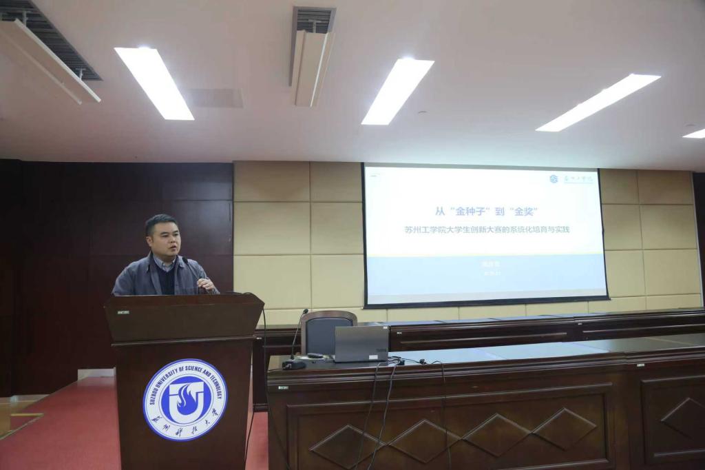 沈孝兵作题为《敢闯会创 面向未来——中国国际大学生创新大赛解读》的专题报告,系统解析赛事体系、赛道定位和评审要点,重点围绕创意组、红旅组和创业组的差异化要求,帮助学生厘清备赛逻辑,并就选题立意、团队建设和材料撰写等关键环节提出针对性建议。汤红胜以《中国国际大学生创新大赛参赛项目的要素分析》为题,从产业和投资视角解读项目评审重点,通过真实案例讲解项目的市场适配性、技术创新性和商业可持续性,引导学生面向产业需求打磨项目,提升成果的现实价值。周步昆围绕《从“金种子”到“金奖”——大学生创新大赛系统化培育实践》,分享了苏州工学院“有组织备赛、成体系培育、全过程跟进”的经验做法,为学校完善双创培育机制提供了有益借鉴。资产经营有限公司副总经理(主持工作)任云高介绍了学校创业园为师生提供的场地支持、创业帮扶、资源对接等核心服务,并明确创业园服务师生、助力创业的定位,欢迎广大师生充分利用园区资源,赋能创业实践。