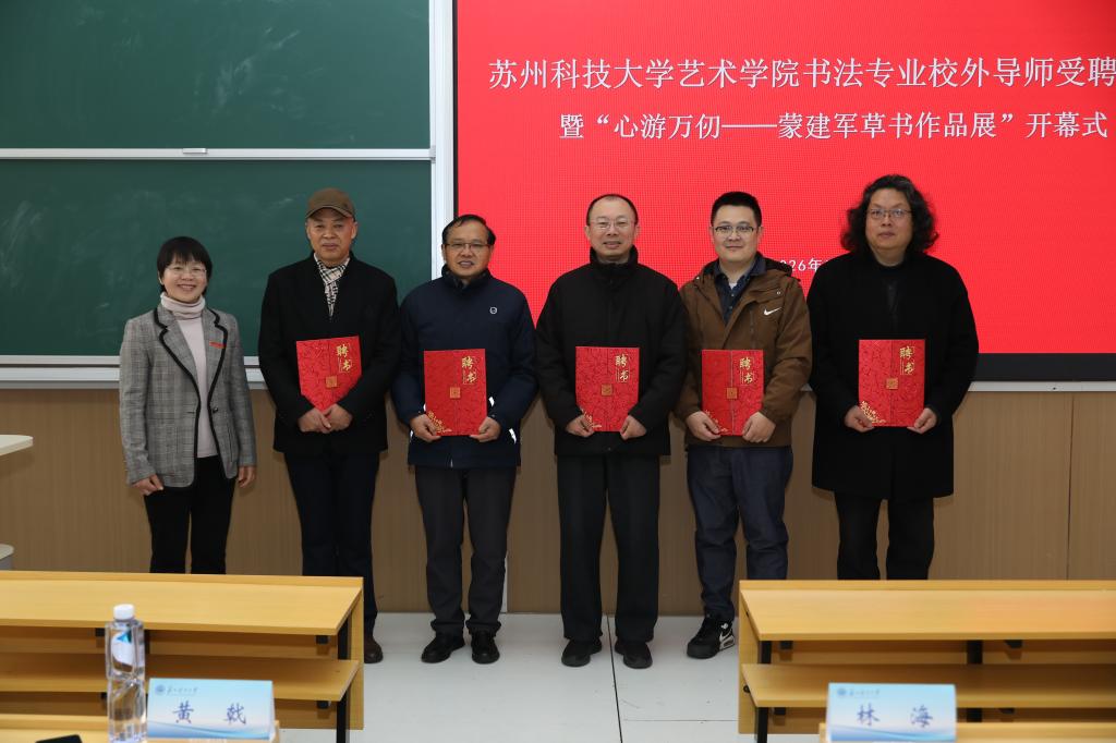 3月19日,艺术学院在江枫校区举行美术与书法专业学位(书法创作与教育方向)校外导师受聘仪式,同期,“心游万仞——蒙建军草书作品展”在学院颜・空间开幕。苏州市人大常委会原秘书长黄戟,陈道义、顾工等10位书法领域知名专家学者,艺术学院党委书记林海、院长莫军华等学院领导及师生代表出席活动,受聘仪式由学院副院长荣侠主持。