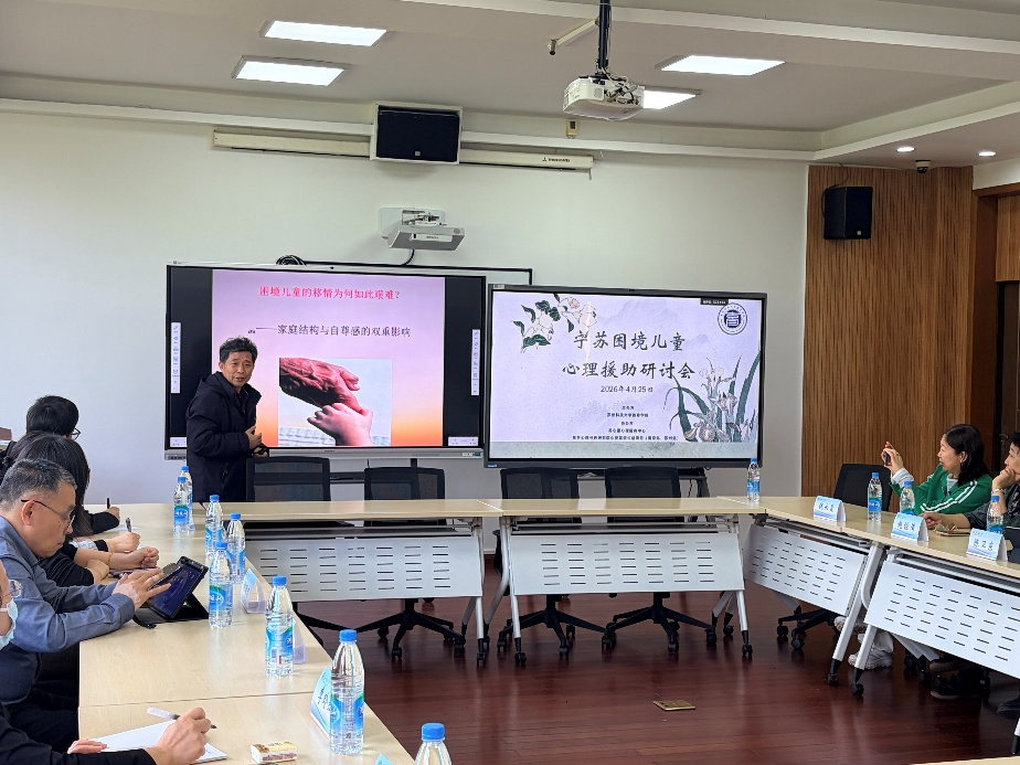 4月25日上午,由教育学院主办的“宁苏困境儿童心理援助研讨会”在我校石湖校区举行。苏州市社会工作和志愿服务联合会会长胡跃忠、苏州市社会福利总院副院长张燕,南京师范大学副教授刘穿石、国际心理分析师钱永霞,以及来自社会福利总院、特教学校、学府实小、心灵花园公益项目、苏心援心理服务中心的一线同仁,教育学院党委书记丛春秋、心理系教师等参加会议。会议由院长陈卫东主持。