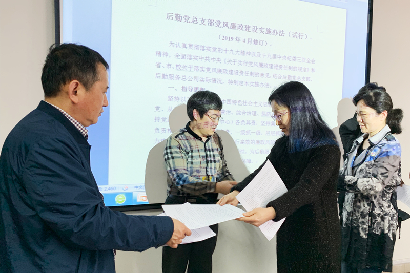与会人员集体观看了警示教育片《不可缺失的敬畏》。许金林详细介绍了调整后的后勤党总支各支部组织架构,传达了全省教育系统全面从严治党工作视频会和校党委2019年全面从严治党工作会议的精神,并结合后勤工作实际对重点内容进行了解读。许金林还带领大家深入学习了《后勤党总支党风廉政建设实施办法(试行)》,强调后勤党总支从严治党工作及党风廉政建设应与后勤公司具体业务工作紧密结合,同部署、同落实、同检查、同考核。现场还组织了《后勤党总支、后勤服务总公司党风廉政建设责任书》签订、递交仪式。